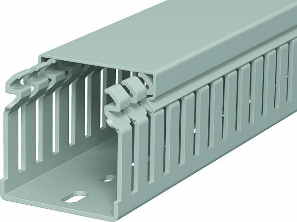 Verdrahtungskanal nach DIN EN 50085-2-3 inkl. Oberteil und Bodenlochung zur waagerechten und senkrechten Verlegung elektrischer Kabel und Leitungen im Schaltschrank. Ausführung als DIN-Kanal. Das Ausbrechen der Stege erfolgt werkzeuglos. Bodenbündiges Ausführen ist durch Sollbruchstellen möglich. Geprüft nach DIN EN 50085-2-3. Sonderlängen auf Anfrage.