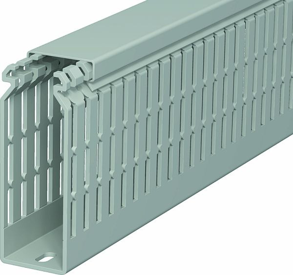 Verdrahtungskanal nach DIN EN 50085-2-3 inkl. Oberteil und Bodenlochung zur waagerechten und senkrechten Verlegung elektrischer Kabel und Leitungen im Schaltschrank. Ausführung als DIN-Kanal. Das Ausbrechen der Stege erfolgt werkzeuglos. Bodenbündiges Ausführen ist durch Sollbruchstellen möglich. Verjüngungen in den Seitenschlitzen verhindern das Herausfallen der Leitungen. Geprüft nach DIN EN 50085-2-3. Sonderlängen auf Anfrage.