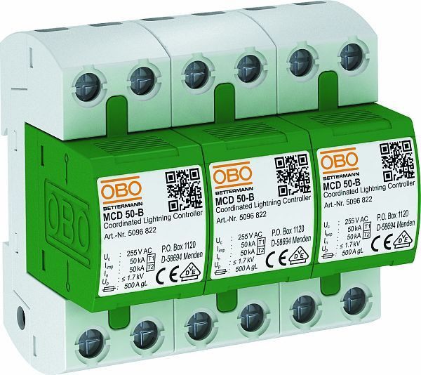 3 x MCD 50-B: Koordinierter Blitzstromableiter Typ 1+2 EN 61643-11. Für Schnittstelle 0 auf 2 (LPZ) gemäß Blitzschutzzonen-Konzept nach IEC 62305 bzw. VDE 0185-305.