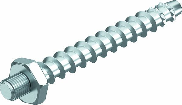Schraubanker zur direkten Montage ohne Dübel in gerissenem und ungerissenem Beton sowie Mauerwerk. Anschlussgewinde M6 für die Befestigung von Schellen mit Gewindefuss.