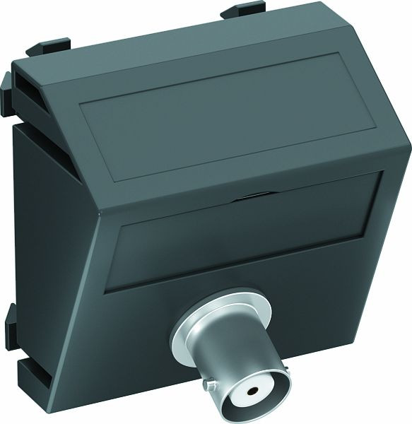 Multimediaträger mit einer BNC Anschlussbuchse, Kabelauslass schräg, mit Beschriftungsfeld, BNC Kupplung in Ausführung Buchse-Buchse. Trägerplatte mit Rastbefestigung, geeignet für den waagerechten und senkrechten Einbau in die Systemumgebung.