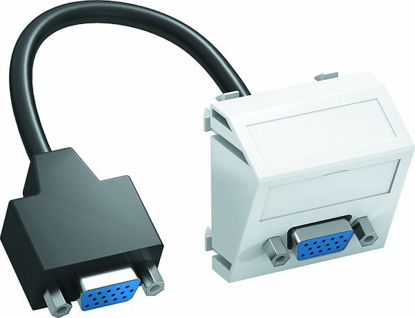 Multimediaträger mit einer VGA-Anschlussbuchse, Kabelauslass schräg, mit Beschriftungsfeld, kurzes VGA-Anschlusskabel (HD15) in Ausführung Buchse-Buchse. Träger mit Rastbefestigung, geeignet für den waagerechten und senkrechten Einbau in die Systemumgebung.