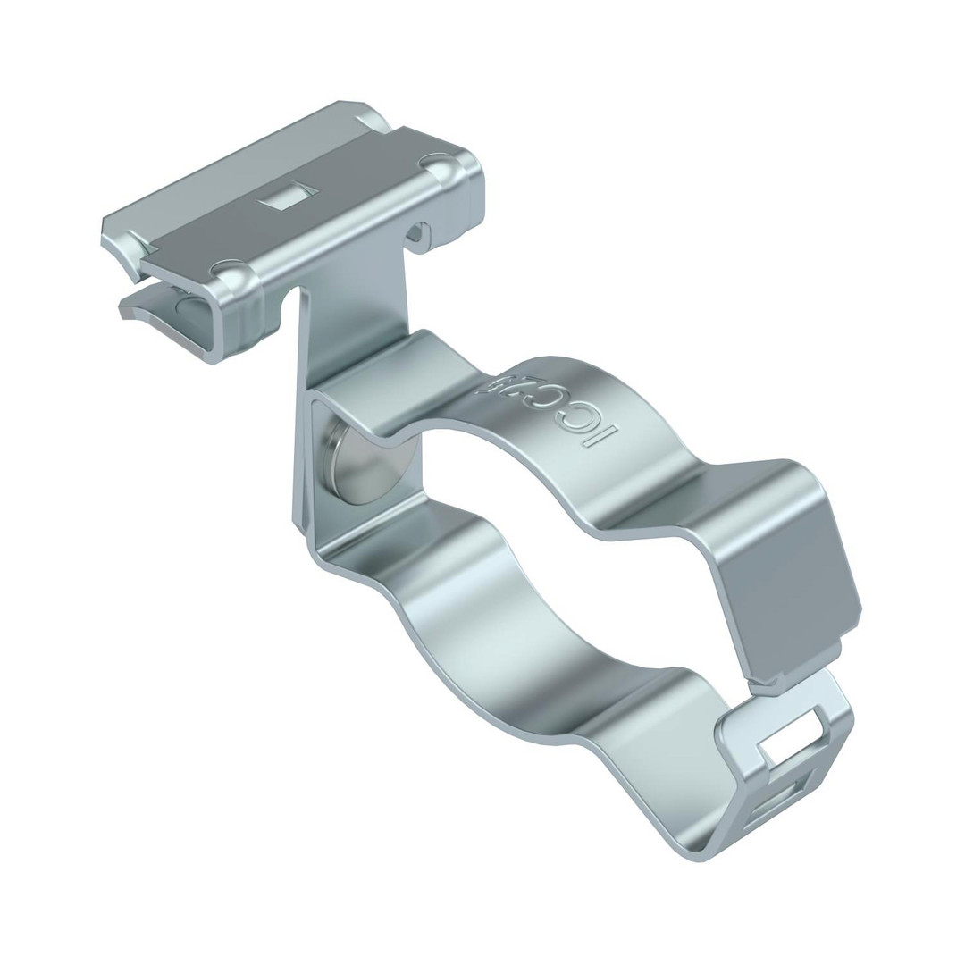 Trägerklammer zum Montieren von Rohren. Geschlossene Rohraufnahme seitlich. Befestigung an Stahträgern durch Aufschlagen.