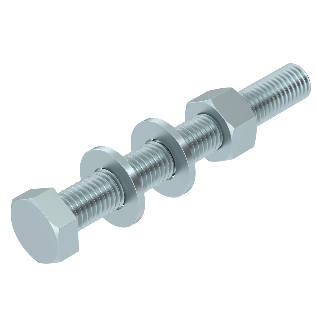Sechskantschraube zur universellen Befestigung von Konstruktionsbauteilen. Inklusive Sechskantmutter und 2 Unterlegscheiben.