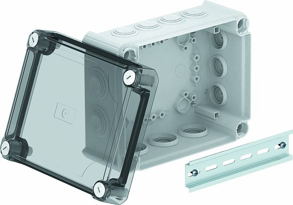 | Kurzbeschreibung | Kabelabzweigkasten mit hohem transparentem Deckel 190x150x94 Polypropylen / Polycarbonat lichtgrau RAL 7035 |