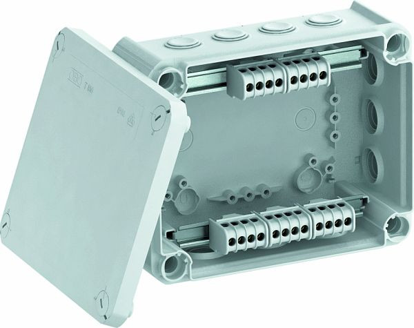 | Kurzbeschreibung | Kabelabzweigkasten mit Klemmleiste + Einführungen 190x150x77 Polypropylen, glasfaserverstärkt lichtgrau RAL 7035 |
