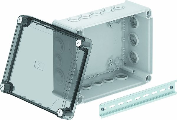 | Kurzbeschreibung | Kabelabzweigkasten mit hohem transparentem Deckel 240x190x115 Polypropylen / Polycarbonat lichtgrau RAL 7035 |