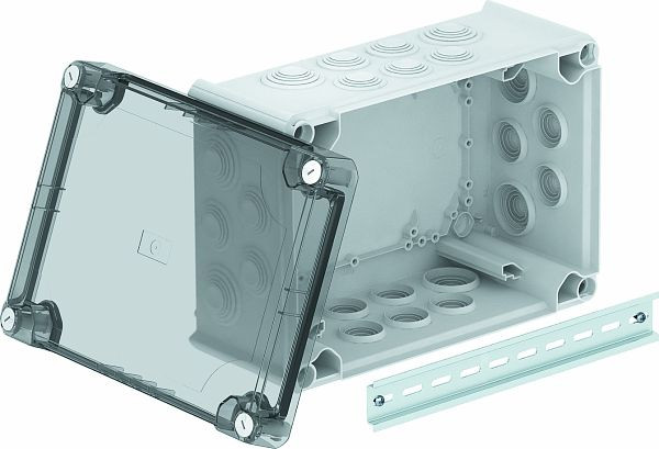 | Kurzbeschreibung | Kabelabzweigkasten mit hohem transparentem Deckel 285x201x139 Polypropylen / Polycarbonat lichtgrau RAL 7035 |