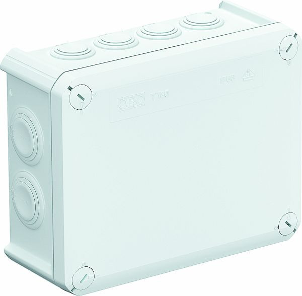 Kabelabzweigkasten gemäß DIN EN 60670. Flammwidrig nach DIN EN 60695-2-11, Prüftemperatur 650°C. Schlagfestigkeit IK05 gemäß DIN EN 50102.