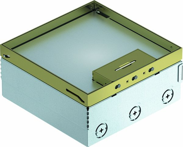 Quadratischer Bodentank für den Einsatz in trocken gepflegten Hohlböden und Estrichböden im Innenbereich. Einbaugehäuse mit vorgeprägten Einführungsöffnungen für Rohre (M25). Mit 2 Universalträgern UT3 und einer 3-fach Steckdose. Oberteil durch 4 Nivellierstützen auf Oberkante Bodenbelag einstellbar. Die Mindesteinbautiefe beträgt 95 mm, der Nivellierbereich + 30 mm.