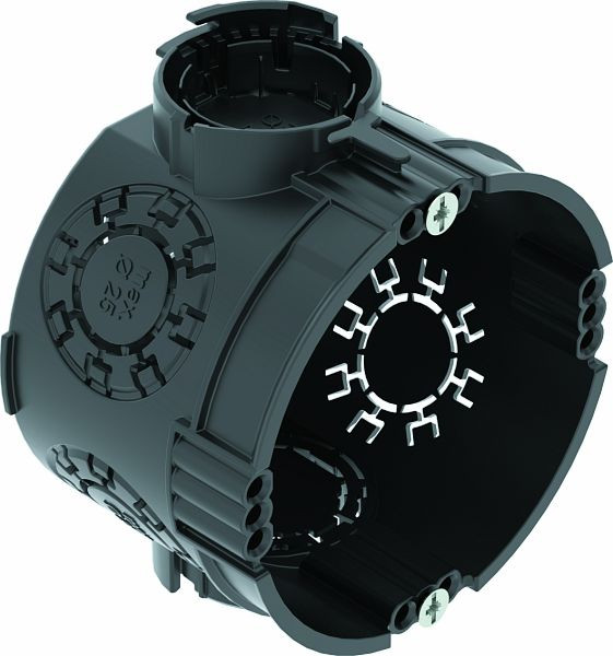 | Kurzbeschreibung | UP Gerätedose mit Geräteschrauben Ø60mm, H46mm Polypropylen tiefschwarz |