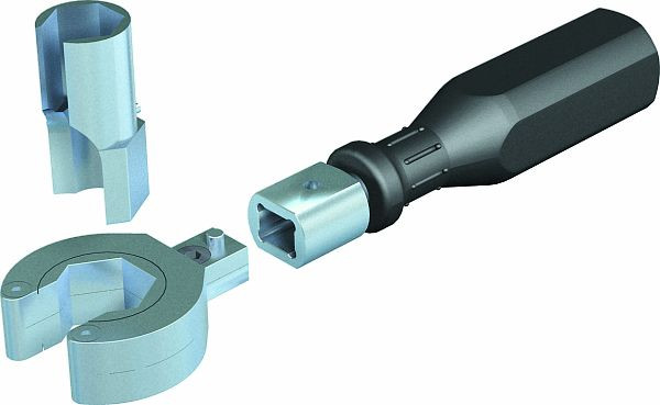 Set bestehend aus einer Grundratsche Typ V-TEC RA, einem Griff für Grundratsche Typ V-TEC GR und vier Steckschlüsselaufsätzen in den Größen SW 15, SW 20, SW 24 und SW 29.