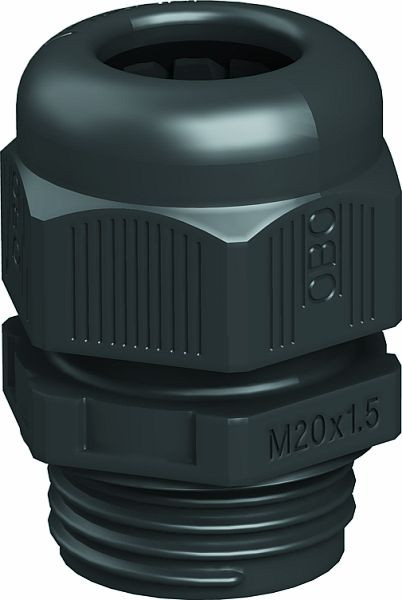 Kabelverschraubung mit metrischem Anschlussgewinde in Hutmutterbauart, für Kabelabzweigkästen, Gehäuse, Verteilerkästen im privaten und industriellen Bereich. Mit Zugentlastung und integrierter Dichtlippe, geprüft nach DIN EN 62444. Schutzklasse IP68. Einsetzbar von -20°C bis +65°C.