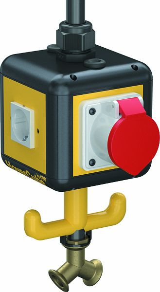 mit Griff und Druckluftanschluss, bestückt, Gehäuse mit Aufhängeöse und Griffhaken und Abdeckplatten, mit 1m Rohr 1/2" und Anschluss für Druckluftschlauch 13 x 3,5 mm und 2-Wege Verteiler 1/2", Bestückt wie folgt: 1 Klemme 3-polig, 3 x 1fach Schutzkontaktsteckdosen 16A/250V mit Schutz gegen Eindringen von Femdkörpern (Kindersicherung), auf einen Wechselstromkreis vorverdrahtet, 1 x CEE Steckdose 16A/415V