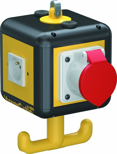 3 x 1-fach-NF-Steckdosen 16 A/250 V mit erhöhtem Berührungsschutz, auf einen Wechselstromkreis vorverdrahtet, Anschluss über 1 x Klemme 3-polig, 1 x CEE-Steckdose 16 A/415 V, mit Trennwand zur Stromkreistrennung.