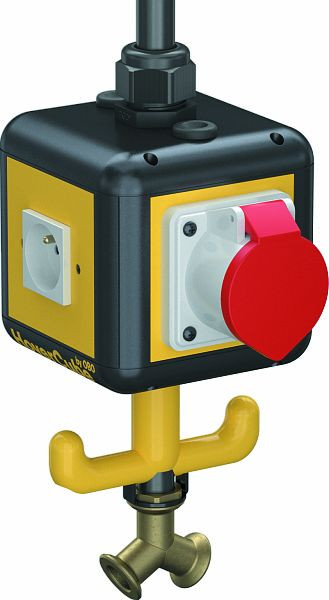 Gehäuse bestückt und vorverdrahtet, mit 1 m Rohr 1/2” und Anschluss für Druckluftschlauch 13 x 3,5 mm und 2-Wege-Verteiler 1/2”, mit Aufhängeöse, Griffhaken und 4 Abdeckplatten.