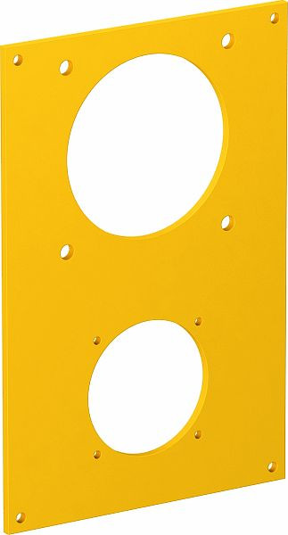 Abdeckplatte mit einer Ø 45-mm-Öffnung zum Einbau einer Anbausteckdose (Typ ASD-...) mit 38-mm-Befestigungsspur und einer Ø 60-mm-Öffnung zum Einbau einer CEE-Steckdose 16/32 A mit 60-mm-Befestigungsspur, inklusiv 8 Schrauben zur Gerätebefestigung.