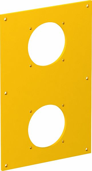Abdeckplatte mit zwei Ø 45-mm-Öffnung zum Einbau von zwei Anbausteckdosen (Typ ASD-...) mit 38-mm-Befestigungsspur, inklusiv 8 Schrauben zur Gerätebefestigung.