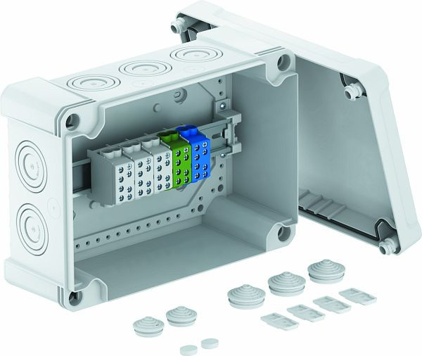 Inklusive 5-poliger Hauptleitungsabzweigklemme mit 2 x 35 mm² + 2 x 25 mm² Leiteranschlussquerschnitten pro Pol.