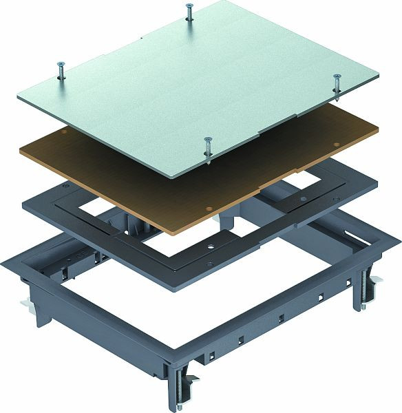 Zugdoseneinsatz zum Blindverschluss einer rechteckigen Montageöffnung der Nenngröße 6 in einem Unterflur-System oder Doppelboden im Innenbereich. Teppichschutzrahmen aus Polyamid.