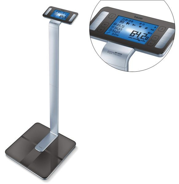 detaillierte Ganzkörperanalyse mit App-Anbindung, Verbindung über Bluetooth®, inklusive Überkreuzmessung mit 8 Elektroden zur genauen Kontrolle der verschiedenen Körperzonen, Trittfläche aus Sicherheitsglas mit ITO-Oberflächenveredelung, gebürstete Edelstahl-Elektroden (Handteil), erhöhtes, beleuchtetes XXL-Display 112 x 65 mm mit Dot-Matrix-Anzeige auf Aluminium-Stele, LCD-Trendanzeige, Anzeige von Datum und Uhrzeit, intiuitive Benutzerführung in 5 Sprachen (D/GB/F/ES/I), Körpergewicht, -fett, -viszeralfett, -wasser, Muskelanteil, Knochenmasse, Körperfett und Muskelanteil segmentiell, BMI, Grundumsatz und Aktivitätsumsatz in Kcal, Einteilung: 50 g/0,1%, 5 Aktivitätsgrade, 10 Benutzerspeicher à 30 Messwertspeicher + Gastmodus, Einschalttechnik: Quick-Start + Button-On, inkl. 4 x 1,5V Batterien AAA, 5 Jahre Garantie