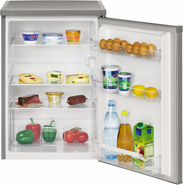 Vollraumkühlschrank, Edelstahl-Optik, Nutzinhalt 133 Liter, 3 Glasablagen davon 2x höhenverstellbar, 3 Türablagen, 2 Eiablagen, transparente Gemüseschale, teilautomatisches Abtausystem, stufenlos regulierbarer Thermostat, Temperaturbereich: 0°C bis +8°C, justierbare Standfüße, wechselbarer Türanschlag rechts, LED Innenraumbeleuchtung, 220-240 V / 50 Hz, 70 W, Klimaklasse: SN/N/ST/T (+10°C bis +43°C), Kühlmittel R600a, Betriebsgeräusch 40 dB, Energieverbrauch / Jahr: 90 kWh, H x B x T 84.5 x 56.0 x 57.5 cm, Nettogewicht: 28.0 kg