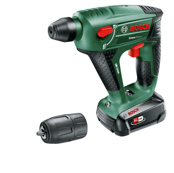 Akku-Bohrhammer UNEO Maxx. Das ultimative 3-in-1-Akku-Werkzeug für umfangreiche Arbeiten. Pneumatisches Hammerwerk für leichtes und schnelles Bohren, auch in Beton. SDS-Systembohrfutter für einen einfachen, intuitiven und zügigen Zubehörwechsel in nur 3 Sekunden. Kompakt und kraftvoll für optimale Handhabung und Leistung. Zum Hämmern, Bohren und Schrauben in Beton, Mauerwerk, Metall, Holz und Fliesen. POWER FOR ALL: ein Akku und ein Ladegerät für das komplette Home & Garden-Gerätesystem. 1 x Akku PBA 18V 2.5Ah. Ladegerät AL 1830 CV. Betonbohrer Ø 6 und 8 mm. Universalbohrer Ø 5 und 6 mm. 4 lange Bits. Rundschaftadapter. Koffer