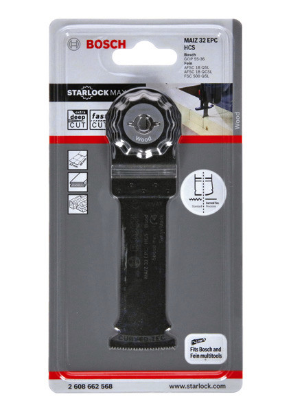 Das Tauchsägeblatt Starlock MAIZ 32 EPC ermöglicht besonders tiefe Schnitte in Holz.? Seine Länge von 80 mm erhöht die Reichweite für ausgedehnte Schnitte. Die direkte Kraftübertragung und das robuste Starlock-Aufnahmesystem reduzieren Lateralschwingung und ermöglichen längere präzise Schnitte. Mit diesen robusten Merkmalen ist dieses Produkt ideal geeignet für tiefe Tauchschnitte in Holz und Holzbalken sowie zum Anfertigungen von Aussparungen für Zapfen und Verbindungen. Das Blatt durchschneidet auch massives Weichholz. Eine abgerundete Blattspitze (Curved-Tec) ermöglicht präzise und glatte Tauchschnitte. Das System Starlock Max ermöglicht selbst bei härtestem Einsatz maximale Schnitttiefe, Geschwindigkeit und Vielseitigkeit. Zusätzlich ermöglicht das Starlock-Aufnahmesystem schnellen Blattwechsel ?in drei Sekunden ohne Blattberührung?. Das spezielle Starlock-Aufnahmesystem ermöglicht durch seine dreidimensionale enge Passung maximale Kraftübertragung zwischen Maschine und Zubehör.