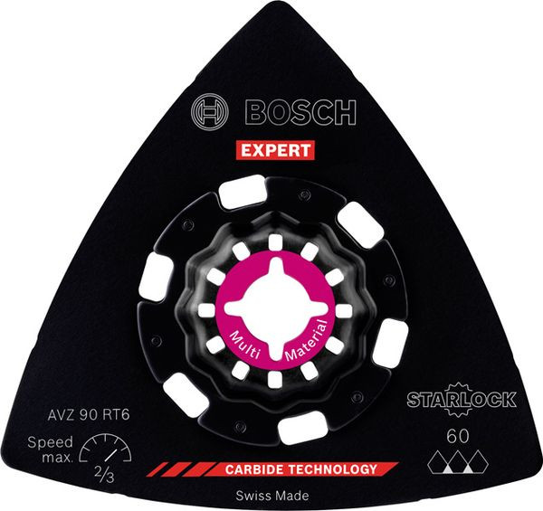 Hohe Lebensdauer beim Schleifen von verschiedensten Materialien! Die Delta-Form ermöglicht das Schleifen von Ecken und Kanten Kleine, aber harte Schleifarbeiten zum Entfernen von altem Material und zum Vorbereiten von Oberflächen sind mit herkömmlichen Schleifmaschinen oder von Hand fast unmöglich zu erledigen. Selbst wenn du die Oberfläche erreichen kannst, reißt das Schleifpapier ein. Mit der EXPERT Sanding Plate kannst du jedoch mit deinem oszillierenden Multifunktionswerkzeug Ecken erreichen und schwierige Materialien schleifen. Die groben, offenen Körner des RT2 (Körnung 20) eignen sich am besten zum Entfernen von Mörtel hinter Fliesen, von Teppichkleber oder für die Grobbearbeitung von Holz. Der RT4 (Körnung 40) eignet sich am besten zum Entfernen von dickem Lack, er kann aber auch mit Mörtel und Kleber umgehen. Der RT6 (Körnung 60) ist der Lackspezialist, während der RT10 (Körnung 100) ideal zum Schleifen und Vorbereiten sauberer Holzoberflächen geeignet ist. Überragende Lebensdauer dank Bosch Carbide Technology