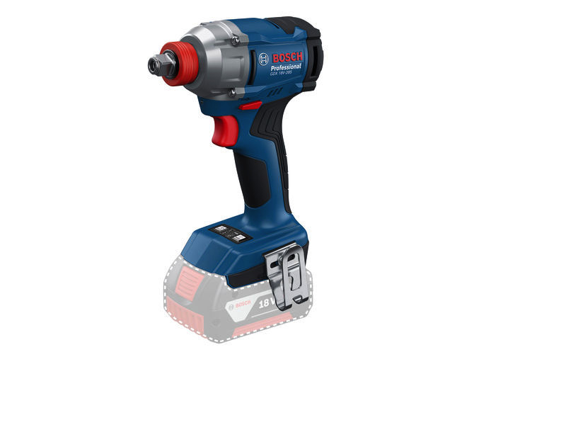 Akku-Drehschlagschrauber GDX 18V-285, Ob im Freien oder im Haus: Das Transportieren und Tragen mehrerer Werkzeuge ist mühsam. Der 2-in-1 GDX 18V-285 vereinfacht dies, da zum Drehen von Schrauben und Bolzen nur ein Werkzeug benötigt wird. Dieses kraftvolle Werkzeug erzeugt ein Drehmoment von 285 Nm und kann Bolzen bis M18 festziehen. Die 2 Drehzahlstufen ermöglichen eine optimale Anpassung von Drehzahl und Drehmoment an die Anwendung. Der 2-in-1-Schlagschrauber GDX 18V-285 optimiert durch sein hohes Drehmoment und die Drehzahlauswahl die Schraubleistung an M8-, M10- und M12-Bolzen. Dieses Werkzeug kann auch zum Drehen von Schrauben verwendet werden, mit selbstschneidenden Schrauben mit 4,2 und 4,8 mm Durchmesser in Blech, mit Holzschrauben mit 4 mm, 5 mm und 8 mm sowie mit M6-, M8- und M10-Schenkelhalsschrauben. 1 x Gürtelclip (1 619 PS0 752)