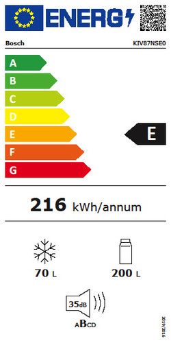 Schleppscharnier, Leistung und Verbrauch Energieeffizienzklasse: E Energieverbrauch / Jahr: 216 kWh/a Geräuscheffizienzklasse / Geräusch-Wert: B / 35 dB Nutzinhalt gesamt: 270 l Design LED Beleuchtung Komfort und Sicherheit Abtau-Automatik im Kühlteil Elektronische Temperaturregelung über LED ablesbar Super-Taste: Super Kühlen Super Gefrieren mit Eingefrierautomatik Akustischer Türalarm bei geöffneter Tür Kühlteil Nutzinhalt Kühlfächer: 200 l 5 Abstellflächen aus Sicherheitsglas 3 Türabsteller und 1 Flaschenabsteller Frischhaltesystem MultiBox XXL: transparente Schublade mit Wellenboden, ideal zur Lagerung von Obst und Gemüse Gefrierteil Nutzinhalt Tiefkühlfächer: 70 l Gefriervermögen in 24 Std.: 3.2 kg Lagerzeit bei Störung : 12 h 2 transparente Gefriergut-Schubladen Maße Gerätemaße ( H x B x T): 177.2 cm x 54.1 cm x 54.8 cm Nischenmaße (H x B x T): 177.5 cm x 56.0 cm x 55.0 cm Technische Informationen Türanschlag rechts, wechselbar 220 - 240 V Länge des Anschlusskabel: 230 cm Klimaklasse: SN-ST Zubehör 1 x Eiswürfelschale Länderspezifische Optionen Auf Basis der Ergebnisse der Normprüfung über 24 Std. Tatsächlicher Verbrauch abhängig von Nutzung/Standort des Geräts.