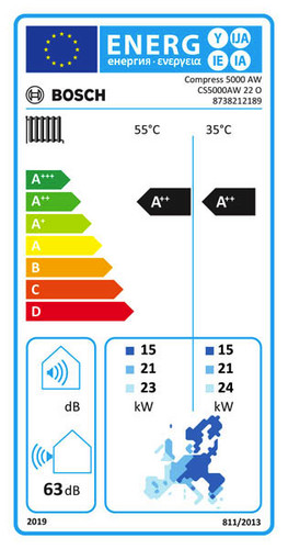 Typ: CS5000AW 22 O Höhe: 1815 mm Breite: 1070 mm Tiefe: 765 mm Nettogewicht: 294 kg Wärmeleistung mit 1 Kompressor bei A-7/W35 (EN14511): 12,5 kW Wärmeleistung mit 1 Kompressor bei A2/W35 (EN14511): 14,1 kW Wärmeleistung mit 1 Kompressor bei A7/W35 (EN14511): 17,6 kW Wärmeleistung mit 1 Kompressor bei A10/W35 (EN14511): 19,9 kW Wärmeleistung mit 1 Kompressor bei A7/W55 (EN14511): 17,40 kW Wärmeleistung mit 2 Kompressoren bei A-7/W35 (EN14511): 22,3 kW Wärmeleistung mit 2 Kompressoren bei A2/W35 (EN14511): 23,7 kW Wärmeleistung mit 2 Kompressoren bei A7/W35 (EN14511): 31 kW Wärmeleistung mit 2 Kompressoren bei A10/W35 (EN14511): 34 kW Wärmeleistung mit 2 Kompressoren bei A7/W55 (EN14511): 29,00 kW COP mit 1 Kompressor bei A-7/W35 (EN14511): 3,3 COP mit 1 Kompressor bei A2/W35 (EN14511): 3,6 COP mit 1 Kompressor bei A7/W35 (EN14511): 4,3 COP mit 1 Kompressor bei A10/W35 (EN14511): 4,8 COP mit 1 Kompressor bei A7/W55 (EN14511): 3,1 COP mit 2 Kompressoren bei A-7/W35 (EN14511): 3,1 COP mit 2 Kompressoren bei A2/W35 (EN14511): 3,4 COP mit 2 Kompressoren bei A7/W35 (EN14511): 4,2 COP mit 2 Kompressoren bei A10/W35 (EN14511): 4,4 COP mit 2 Kompressoren bei A7/W55 (EN14511): 2,7 SCOP @ W35 bei durchschnittlichem Klima (EN14825): 4 SCOP @ W55 bei durchschnittlichem Klima (EN14825): 3,33 Max. Vorlauftemperatur im Heizbetrieb: 64 °C Nennbetriebsstrom: 11,8 A Anlaufstrom mit Sanftanlasser: 30 A Elektrischer Anschluss: 400 V Elektrische Absicherung: 25 A Schutzart (EN 60529): IP24 IP Klasse für die jahreszeitbedingte Raumheizungs-Energieeffizienz (55°C Vorlauftemperatur): A++ Energieeffizienzklassen-Spektrum: A+++ -> D Jahreszeitbedingte Raumheizungs-Energieeffizienz bei durchschnittlichen Klimaverhältnissen (55°C Vorlauftemperatur): 125 % Nennwärmeleistung bei durchschnittlichen Klimaverhältnissen (55°C Vorlauftemperatur): 21 kW Klasse für die jahreszeitbedingte Raumheizungs-Energieeffizienz (35°C Vorlauftemperatur): A++ Energieeffizienzklassen-Spektrum: A+++ -> D Jahreszeitbedingte Raumheizungs-Energieeffizienz bei durchschnittlichen Klimaverhältnissen (35°C Vorlauftemperatur): 152 % Nennwärmeleistung bei durchschnittlichen Klimaverhältnissen (35°C Vorlauftemperatur): 21 kW Schallleistungspegel im Freien: 63 dB (A) Umwelttechnischer Hinweis: Enthält fluorierte Treibhausgase Kältemitteltyp: R407C Treibhauspotential des Kältemittels (GWP): 1774 kgCO2-eq Kältemittel-Füllmenge: 5,6 kg CO2-Äquivalent der Kältemittel-Füllmenge: 9,934 toCO2-eq Bauart des Kältekreises: Hermetisch geschlossen Hersteller: Bosch Thermotechnik GmbH Bestell-Nr.: 8738212189 Verpackungsabmessung: 880x1150x1960 mm Gesamtgewicht inkl. Verpackung: 324 kg