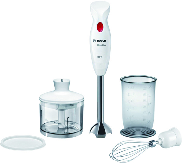 abnehmbarer Mixstab aus Edelstahl, 4-Klingen-Messer QuattroBlade, spritzarmes Arbeiten dank speziell geformter Mixfußglocken, Universalzerkleinerer, Schlagbesen, skalierter Mixbecher