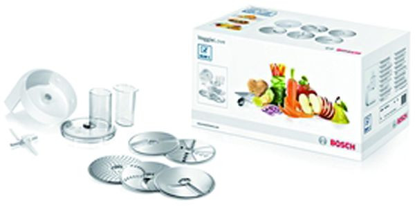 inkl. Schneid-Wendescheibe (dick und dünn), Raspel- Wendescheibe (grob und fein) und Reibscheibe mittelfein (=5 Funktionen), zusätzlich Asia-Gemüse-Scheibe, Kartoffelpuffer-Rösti-Scheibe; Scheiben aus Edelstahl, Deckel mit Einfüllhilfe und Stopfer, Deckelverriegelung