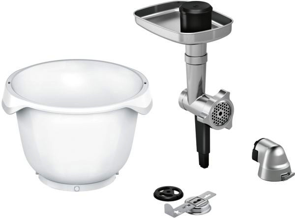Fleischwolf mit Lochscheibe (Durchmesser 5 mm), Messer, Edelstahl-Einfüllschale und Stopfer, Aluminiumdruckguß, ausbaufähig mit individuellem Sonderzubehör, Spritzgebäckvorsatz mit Metallschablonen für 4 verschiedene Spritzgebäck-Formen, Kunststoff-Rührschüssel 5,5 l für bis zu 1,5 kg Mehl plus Zutaten bei Hefeteig, bis zu 3,5 kg Rührteig Adapter