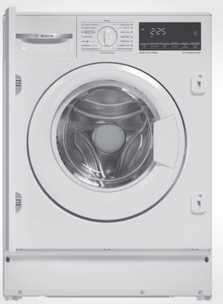 Leistung und Verbrauch Energieeffizienzklasse Waschen und Trocknen¹: E Energieeffizienzklasse Waschen²: A Stromverbrauch³ / Wasserverbrauch4 Waschen und Trocknen: 324 kWh / 80 Liter Stromverbrauch5 / Wasserverbrauch6 Waschen: 47 kWh / 48 Liter Beladung Waschen und Trocknen / Waschen: 1 - 5 kg / 1 - 8 kg Programmlaufzeit7 Waschen und Trocknen / Waschen: 9:20 h:min / 3:38 h:min Schleudereffizienzklasse: B Schleuderdrehzahl**: 600 - 1400 U/Min. Geräuschwert: 68 dB (A) re 1 pW Geräuscheffizienzklasse: A Programme Standardprogramme Waschen: Baumwolle, Pflegeleicht, Fein/Seide, Wolle/Handwäsche Spezialprogramme Waschen: Trommel reinigen (mit Erinnerungsfunktion), ExtraKurz 15', Hygiene Care, Mix, Schleudern/Abpumpen, Spülen / Schleudern Alle gängigen Waschprogramme können wahlweise auch als reines Trockenprogramm oder als kombiniertes Wasch- und Trockenprogramm genutzt werden Standardprogramme Trocknen: Baumwolle, Pflegeleicht Iron Assist: Entknittert saubere, trockene Kleidung mit Dampf in 20 Minuten.* Trocknungszeit wählbar für intensive und schnonende Trocknungsprogramme Spezialprogramme Trocknen: Auffrischen, Intensiv trocknen, Schontrocknen, Waschen & Trocknen 60' Optionen SpeedPerfect: perfekt sauber in bis zu 65% weniger Zeit. *** Optionen Waschen: Drehzahlwahl, Extra Spülen, Lieblingsprogramme, SpeedPerfect, Start / Nachlegen, Temperaturwahl, Vorwäsche Optionen Trocknen: Bügeltrocken, Schranktrocken Trocknen-Option für die meisten Waschprogramme AutoDry-Funktion, Zeitprogramme Komfort und Sicherheit Nachlegefunktion: Die Nachlegefunktion ermöglicht Ihnen das Nachlegen von Wäschestücken sogar nach Start des Waschprogramms. Großes Display für Programmablauf, Temperatur, Drehzahl, Restzeit und 24 h Endezeitvorwahl, Anzeige der Trockenziele ActiveWater Plus: für effizienteste Wassernutzung auch bei kleinen Waschladungen dank automatischer Beladungskennung. Möbeltüranschlag wechselbar Vollelektronische Einknopf-Bedienung für alle Wasch- und Spezialprogramme Trommelreinigung mit Erinnerungsfunktion Trommelinnenbeleuchtung: LED EcoSilence Drive: leiser Motor mit langer Lebensdauer Schaumerkennung Unwuchtkontrolle Signal am Programmende Kindersicherung Tür mit Glasabdeckung Metallverschlusshaken Magnetverschluss für sofortiges Türöffnen am Programmende AquaStop®: eine Bosch Garantie bei Wasserschäden - ein Geräteleben lang* Technische Informationen Einbau-Waschtrockner, vollintegriert verstellbare Sockelhöhe: 16 cm verstellbare Sockeltiefe: 8 cm Gerätemaße (H x B): 82.5 cm x 59.5 cm Gerätetiefe: 52.5 cm Gerätetiefe inkl. Tür: 54.0 cm Gerätetiefe mit geöffneter Tür: 97.5 cm