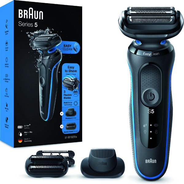 3 flexible Klingen passen sich den Gesichtskonturen an, AutoSense-Technologie erkennt die Bartdichte und passt die Leistung entsprechend an, EasyClick-System (kann mit einem einfachen Klick umgerüstet und die Aufsätze ausgetauscht werden), inkl. Präzisionstrimmer-Aufsatz und 3-Tage-Bart-Trimmer-Aufsatz, 100 % wasserdicht, Li-ION-Akku, Akkukapazität 50 Min., Schnell-Ladefunktion für eine Rasur 5 Min., Netzteil, Schutzkappe, Made in Germany
