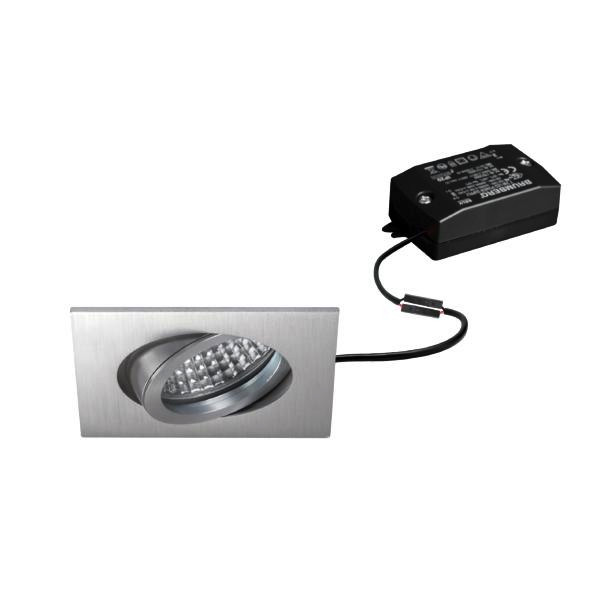 LED-Einbaustrahlerset, schaltbar, aluminium matt, quadratisch. Ausgeführt in kompakter Bauform für werkzeuglose Schnellmontage zum Deckeneinbau. Montageart: Einbaumontage, Montageort: Deckenmontage, Material: Aluminium / Glas / Kunststoff, Schutzart raumseitig: nach DIN EN 60529: IP20, Schutzklasse: (EN 61140) II, Spannung: 230V AC 50Hz, Leistung: 6 W, Anzahl der Leuchtmittel / Fassungen: 1 Stück, Lichtstrom: 730 lm, Farbtemperatur: 3.000 K, Lichtfarbe: weiß, Abstrahlwinkel: 38°, Verstellbarkeit: schwenkbar, Mit Betriebsgerät: Ja, Dimmbar: Nein, Art der Dimmung: schaltbar.