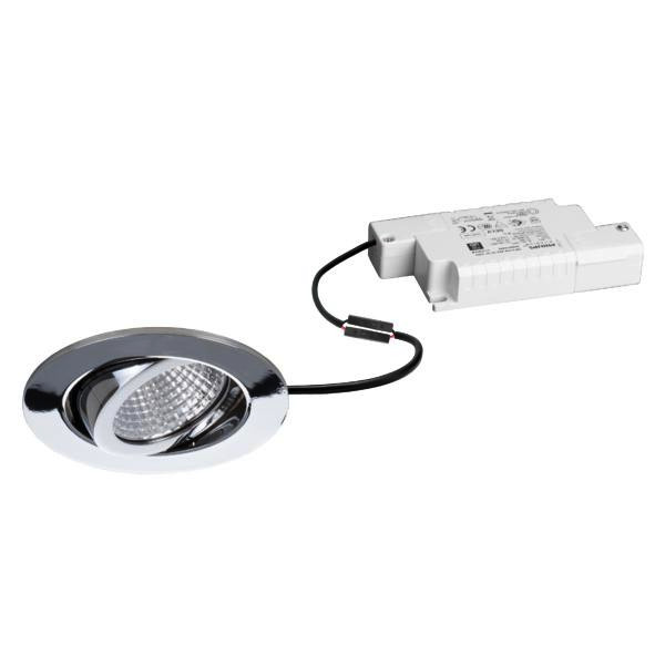LED-Einbaustrahlerset, IP65, Phasenabschnitt dimmbar, chrom glänzend, rund. Ausgeführt in kompakter Bauform für werkzeuglose Schnellmontage zum Deckeneinbau. Ausführung: ohne Fassung, Montageart: Einbaumontage, Montageort: Deckenmontage, Material: Aluminium / Stahl / Silikonkautschuk / Polycarbonat, Schutzart raumseitig: nach DIN EN 60529: IP65, Schutzklasse: (EN 61140) II, Spannung: 230V AC 50Hz, Leistung: 6 W, Anzahl der Leuchtmittel / Fassungen: 1 Stück, Lichtstrom: 730 lm, Farbtemperatur: 3.000 K, Lichtfarbe: weiß, Abstrahlwinkel: 38°, Verstellbarkeit: schwenkbar, Mit Betriebsgerät: Ja, Dimmbar: Ja, Art der Dimmung: Phasenabschnitt.