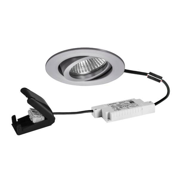 LED-Einbaustrahlerset, dim2warm, Phasenabschnitt dimmbar, mit Anschlussbox, alu matt, rund. Ausgeführt in kompakter Bauform für werkzeuglose Schnellmontage zum Deckeneinbau. Wird die Leuchte gedimmt, verringert sich die Farbtemperatur. Set inkl. Konverter für 230 V-Netzspannung, Phasenabschnitt dimmbar, Maße Konverter: L 110 x B 50 x H 19 mm Montageart: Einbaumontage, Montageort: Deckenmontage, Material: Aluminium / Glas / Kunststoff, Schutzart raumseitig: nach DIN EN 60529: IP20, Schutzklasse: (EN 61140) II, Spannung: 230V AC 50Hz, Leistung: 6 W, Anzahl der Leuchtmittel / Fassungen: 1 Stück, Lichtstrom: 460 lm, Farbtemperatur: von 3.000 K bis 1.800 K, Abstrahlwinkel: 38°, Verstellbarkeit: schwenkbar, Mit Betriebsgerät: Ja, Dimmbar: Ja, Art der Dimmung: Phasenabschnitt.