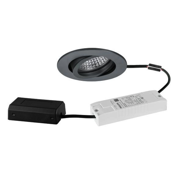 LED-Einbaustrahlerset, DALI dimmbar, mit Anschlussbox, titan matt, rund. Ausgeführt in kompakter Bauform für werkzeuglose Schnellmontage zum Deckeneinbau. Montageart: Einbaumontage, Montageort: Deckenmontage, Material: Aluminium / Glas / Kunststoff, Schutzart raumseitig: nach DIN EN 60529: IP20, Schutzklasse: (EN 61140) II, Spannung: 230V AC 50Hz, Leistung: 6 W, Anzahl der Leuchtmittel / Fassungen: 1 Stück, Lichtstrom: 730 lm, Farbtemperatur: 3.000 K, Abstrahlwinkel: 38°, Verstellbarkeit: schwenkbar, Mit Betriebsgerät: Ja, Dimmbar: Ja, Art der Dimmung: DALI-2.