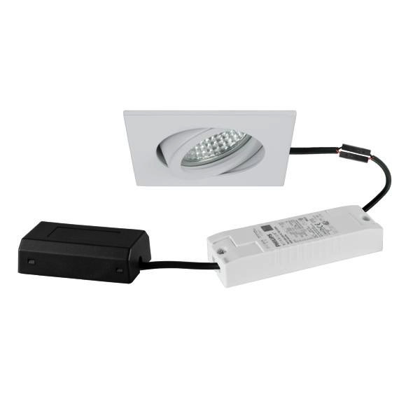 LED-Einbaustrahlerset, DALI dimmbar, mit Anschlussbox, weiß matt, quadratisch. Ausgeführt in kompakter Bauform für werkzeuglose Schnellmontage zum Deckeneinbau. Montageart: Einbaumontage, Montageort: Deckenmontage, Material: Aluminium / Glas / Kunststoff, Schutzart raumseitig: nach DIN EN 60529: IP20, Schutzklasse: (EN 61140) II, Spannung: 230V AC 50Hz, Leistung: 6 W, Anzahl der Leuchtmittel / Fassungen: 1 Stück, Lichtstrom: 730 lm, Farbtemperatur: 3.000 K, Lichtfarbe: weiß, Abstrahlwinkel: 38°, Verstellbarkeit: schwenkbar, Mit Betriebsgerät: Ja, Dimmbar: Ja, Art der Dimmung: DALI-2.