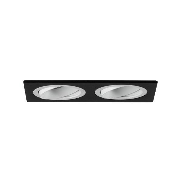 Einbaugehäuse, rechteckig, bündig, 2-fach, mit Modulhalterungen vertieft, schwenkbar, ohne LED-Module, schwarz struktur / weiß struktur, quadratisch. Ausgeführt in kompakter Bauform für werkzeuglose Schnellmontage zum Deckeneinbau. Ausführung: ohne Fassung, Montageart: Einbaumontage, Montageort: Deckenmontage, Material: Aluminium, Schutzart raumseitig: nach DIN EN 60529: IP20, Schutzklasse: (EN 61140) III, Leistung: 13 W, Anzahl der Leuchtmittel / Fassungen: 2 Stück, Verstellbarkeit: schwenkbar, ohne Betriebsgerät, Dimmbar: Abhängig vom Betriebsgerät, Art der Dimmung: Abhängig vom Betriebsgerät.
