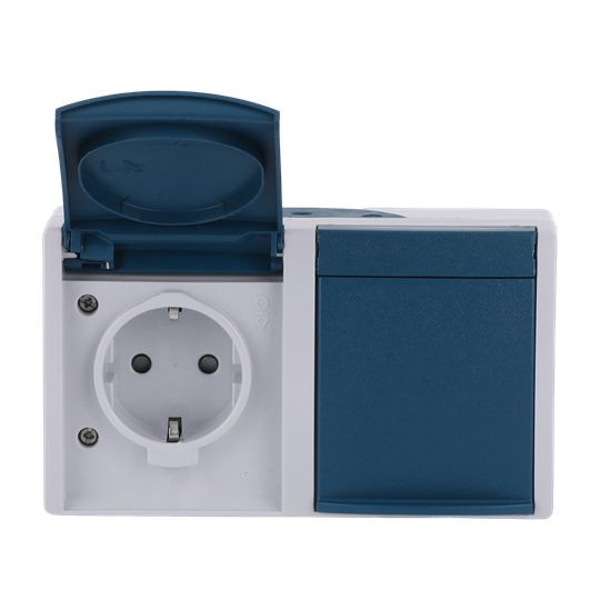 Mit integriertem erhöhtem Berührungsschutz. 2-fach Für waagerechte Montage. Mit Steckanschluss. Vorverdrahtet. Mit Klappdeckeln. 2 P + E, Nennspannung: 250 V~, Nennstrom: 16A