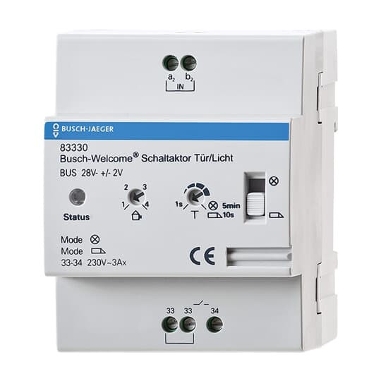 zum Anschluss eines elektrischen Türöffners oder zum Schalten des Lichtes bzw. zum Anschluss eines Lichtrelais, Zuordnung einer Außenstation einstellbar Zum Anschluss eines elektrischen Türöffners oder zum Schalten des Lichtes bzw. zum Anschluss eines Lichtrelais (potentialfreier Ausgang 230 V, 3A). Zuordnung zu einer Außenstation einstellbar. Schaltdauer einstellbar: Türöffner 1 s bis 10 s, Licht 1 s bis 5 min. Verbrauchseinheiten: 2. Hochohmige Türöffner verwenden. Nennwiderstand min. 20 Ohm. Produktreihe: Busch-Welcome® 2-Draht?