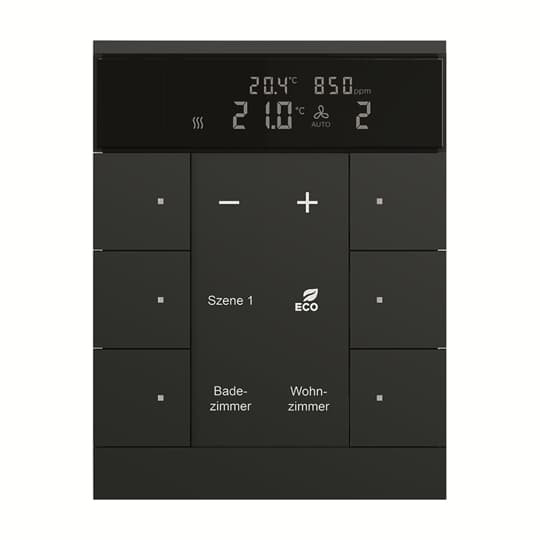 Bedienelement mit Raumtemperaturreglerfunktion und CO2-/Feuchtesensor.