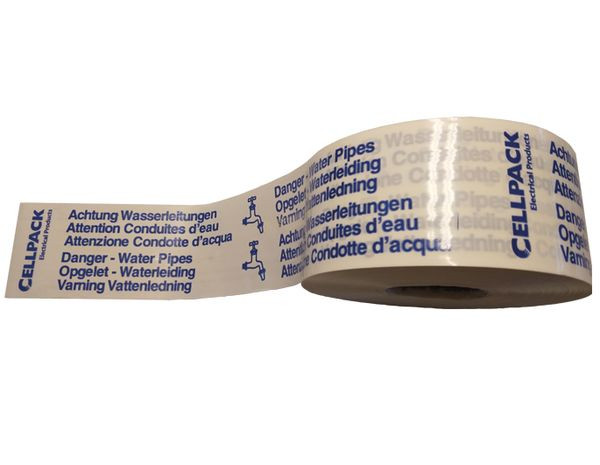Warnband mit mehrsprachigem Aufdruck: Achtung Wasserleitungen, Attention Conduites d'eau, Attenzione Condotte d'acqua, Danger - Water Pipes, Opgelet - Waterleiding, Varning Vattenledning