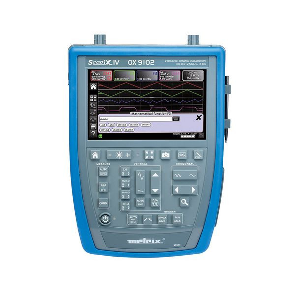 Das OX 9102 ist ein tragbares, netzunabhängiges Digitaloszilloskop der Serie SCOPIX IV der Generation Tablet-Icons mit 2 völlig isolierten Kanälen bis 600 V und mit 100 MHz Bandbreite. Die Speichertiefe in jedem Kanal beträgt 100 KPunkte, so dass auch sehr lange Signalaufzeichnungen möglich sind.