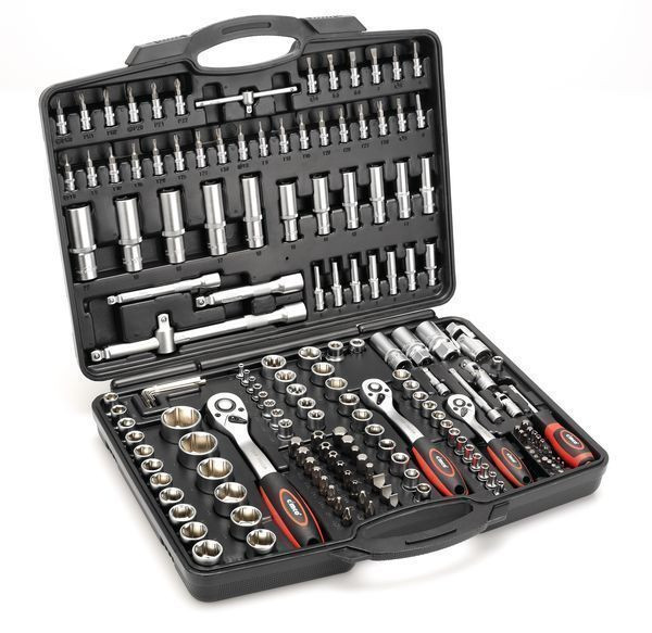 Steckschlüssel-Satz 171-teilig, aus Chrom-Vanadium-Stahl, in einer stabilen Kunststoffbox, Antrieb 6,3 mm (1/4"), 10 mm (3/8") und 12,5 mm (1/2"). Einsätze in Sechskant für ein maximales Drehmoment. Mit 6,3 mm (1/4") Antrieb: Sechskanteinsatz 4-4,5-5-5,5-6-7-8-9-10-11-12-13-14 mm; Sechskanteinsatz extra lang 4-5 6-7-8-9-10 mm; Verlängerung in 50 und 100 mm; Steckschlüsseleinsatz, E-Profil E4-E5-E6-E7-E8; für TX-Schrauben T8-T9-T10-T15-T20-T25-T27-T30; für TX-Schrauben mit Bohrung: T8-T9-T10-T15-T20-T25-T27-T30; Kreuzeinsatz Pozidriv PZ0-PZ1-PZ2; ; Innensechskant-Einsatz 3-4-5-6 mm; Schlitzeinsatz 4-5,5-6,5-7 mm; Kreuzeinsatz Phillips PH0-PH1-PH2; Kardangelenk; Handgriff 150 mm; Umschaltknarre 145 mm, 72 Zähne feinverzahnt; Quergriff mit Gleitkopf 1/4"110 mm; Adapter für 6,3 mm Bits; Mit 10 mm (3/8") Antrieb: Sechkanteinsatz 10-11-12-13-14-15-16-17-18-19 mm; Sechskanteinsatz extra lang 10-11-12-13-14-15 mm; Steckschlüsseleinsatz, E-Profil E10-E11-E12-E14-E16-E18; Verlängerung 125 mm; Umschaltknarre 205 mm, 72 Zähne feinstverzahnt; Zündkerzeneinsatz 18 mm; Kardangelenk; Adapter für 8 mm Bits; Mit 12,5 mm (1/2") Antrtieb: Sechskanteinsatz 10 – 11 – 12 – 13 – 14 – 15 – 16– 17 – 18– 19 – 20 – 21 – 22 – 24 – 27 – 30 – 32 mm, Sechskanteinsatz extra lang 16 – 17 – 18 – 19 – 22 mm, Steckschlüsseleinsatz, E-Profil E20 – E24, Zündkerzeneinsatz 16 – 21 mm, Verlängerung 125 mm; Umschaltknarre 250 mm, 72 Zähne feinstverzahnt; Quergriff mit Gleitkopf 1/2"250 mm; Kardangelenk, Adapter für 8 mm Bits; Schraubendrehbits in 8 mm Antrieb und 30 mm Länge: für TX-Schrauben T40 – T45 – T50 – T55 – T60 – T70; für TX-Schrauben mit Bohrung T40 – T45 – T50 – T55 – T60 – T70 ; • Innensechskant-Einsatz 7 – 8 – 10 – 12 – 14 mm; • Kreuzeinsatz Phillips PH 3 – PH 4; • Schlitzeinsatz 8 – 10 – 12 mm; • Kreuzeinsatz Pozidriv PZ 3 – PZ 4; Schraubendrehbits in 6,3 mm (1/4”) Antrieb x 25 mm Länge: • Vielzahn-Einsatz M5 – M6 – M8; • für TX-Schrauben T5 – T6 – T7; • für TX-Schrauben mit Bohrung T7; RB-Profil-Einsatz M5 – M6– M7 – M8 – M9; • Fünfstern-Einsatz TS10 – TS15 – TS20 – TS25 – TS27 – TS30 –??TS40 – TS45; Innensechskant-Winkelschlüssel: • 1,27 – 1,5 – 2 – 2,5 – 3 – 4 – 5 mm