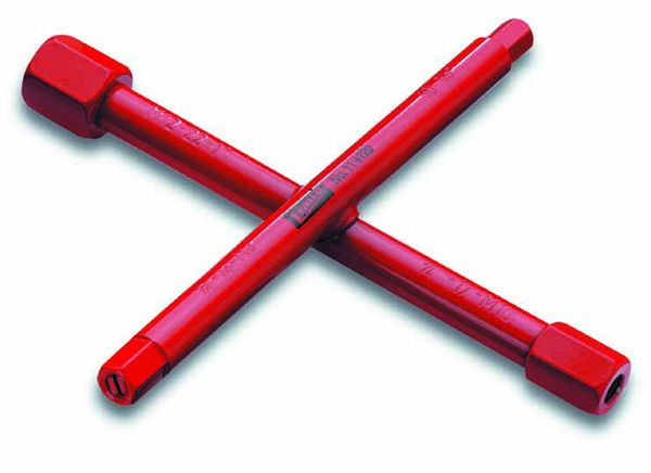 Sanitär-Kreuzschlüssel mit abgesetzten Flächen, daher für alle Fabrikate geeignet.Für Hahnverlängerungen 3/8" -1/2" - 3/4" - 1", mit Gewinde für Stockschrauben M10+M12